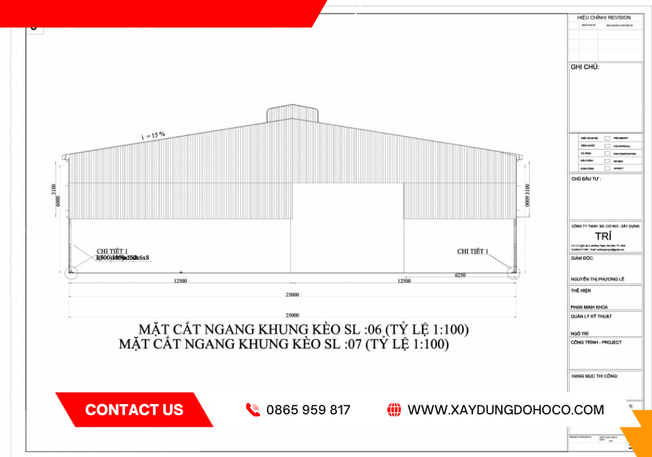 - Mặt cắt: Cho bạn thấy cấu tạo bên trong, tư độ dày của lớp bê tông nền đến độ dốc của mái tôn. Bạn có thể tham khảo thêm về tiêu chuẩn thiết kế nhà xưởng để hiểu rõ hơn về thông số kỹ thuật bắt buộc.
