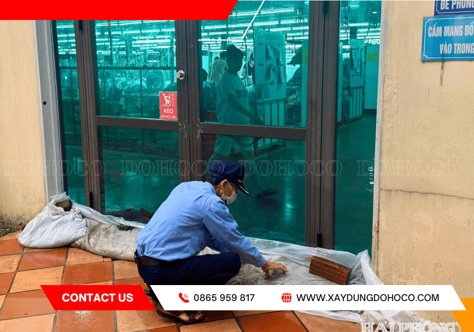 - Phân công trực ban: Bố trí nhân sự theo dõi liên tục các vị trí dễ bị dột ( mái tôn, mối nối, khu vực cửa). Để kịp thời dùng xô chậu hứng nước và đặt biển cảnh báo khu vực trơn trợt.